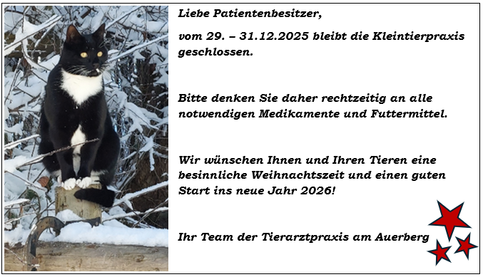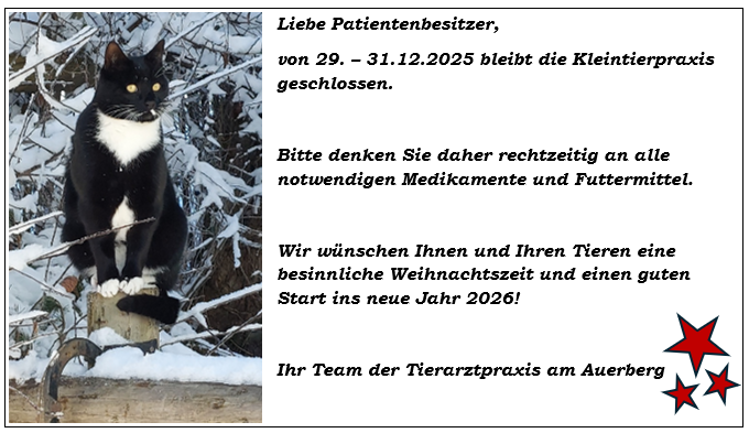Um unnötige Wartezeiten und Streß durch andere Tierkontakte zu vermeiden, bieten wir keine offene Sprechstunde an. Bitte vereinbaren Sie unbedingt telefonisch einen Termin bevor Sie zu uns in die Praxis kommen!